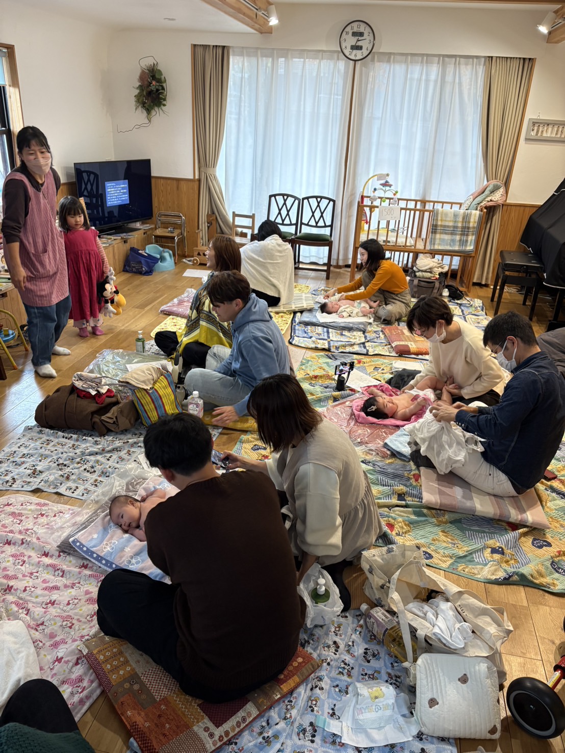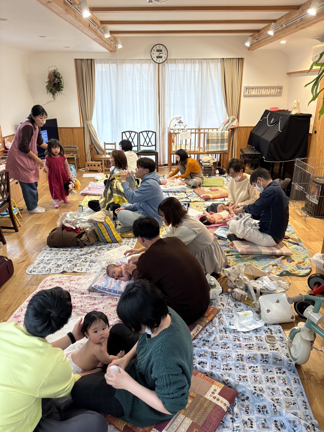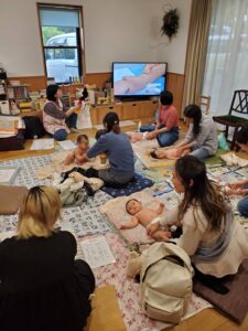 初めてのパパ参加ベビマ、初めての試みで主催側もどうなるかドキドキでしたが、パパ一緒4組、ママのみ2組。月齢2ヶ月から9ヶ月の赤ちゃんたちが来てくれました!
