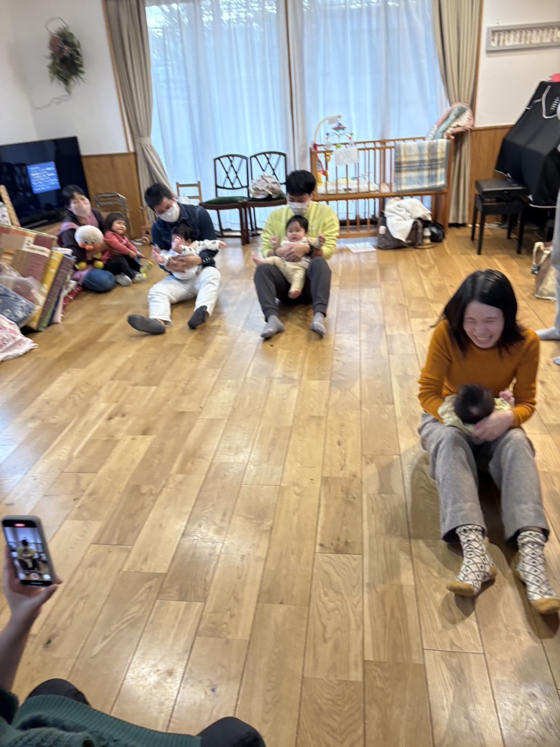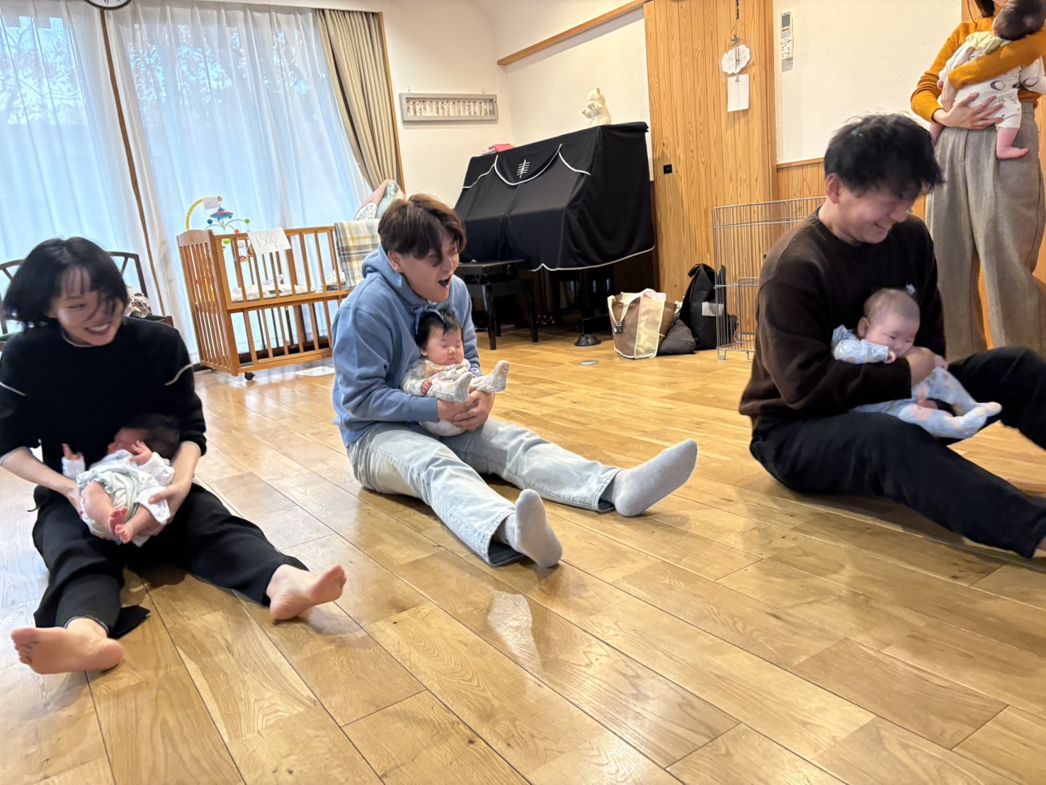 最後に赤ちゃんを抱っこしてお尻歩きでレース対決もしてみましたが、意外にも産後3ヶ月のママの方が軽やかで、パパ達頑張って〜っとみんなで応援してとっても和気藹々とした時間となりました。